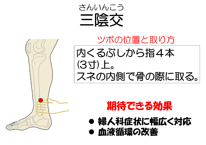 ※このツボはくるぶしから、指4本分上がったところと、スネの骨の脇のくぼんだところが交わるところを言います。