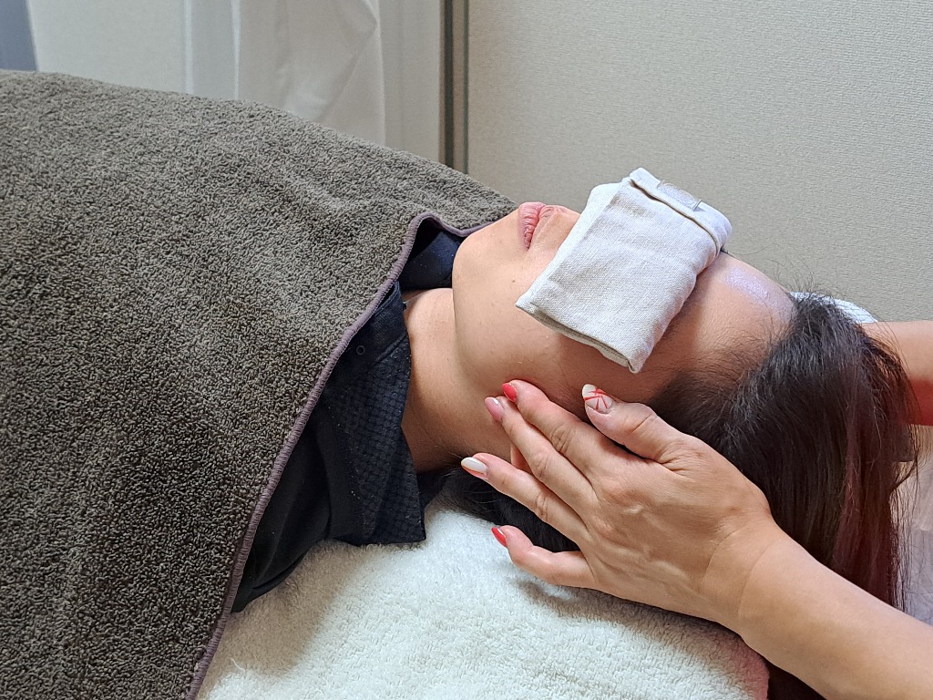 身体を温め、頭からデコルテやお顔も優しいタッチで癒していく施術です。